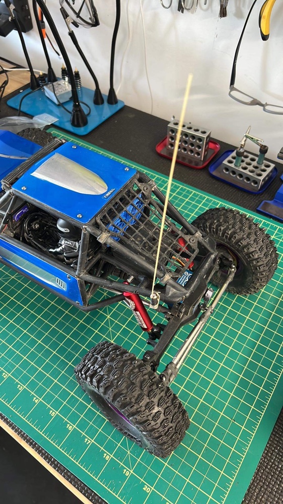 Got some Desert Lizard 100mm shocks from my buddy and crafted a nice antennae from a guitar string and a bolt attached it with a small metal clamp that I made from a picture frame hanger. It looks good but let’s see how it holds up on a tumble.